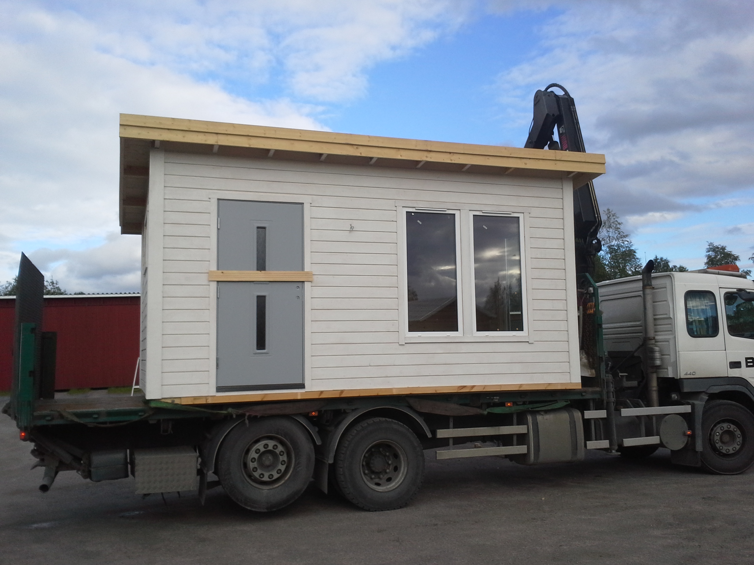 Färdig stuga på väg till kund. Denna stuga är komplett med elinstallation. Kund målar sista varvet på stugan när den är ställd på plats.